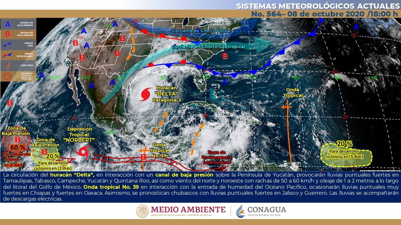 A las 5:30 horas, tiempo del centro de México, el centro del Huracán Delta ingresó a tierra en las inmediaciones de Puerto Morelos, Quintana Roo, debilitándose a categoría 2 en la escala Saffir-Simpson. Se localizó a 35 km al sur de Cancún, Quintana Roo, con vientos máximos de 175 kilómetros …