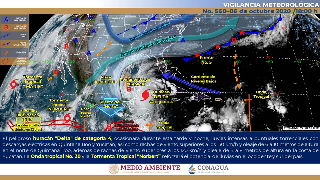 Hoy, los remanentes de Gamma se localizarán en tierra sobre Yucatán, originando lluvias torrenciales (de 150 a 250 milímetros [mm]) en Campeche y Quintana Roo; intensas (de 75 a 150 mm) en Yucatán, además de vientos con rachas fuertes y oleaje elevado en sus costas. Las lluvias podrán ser con …