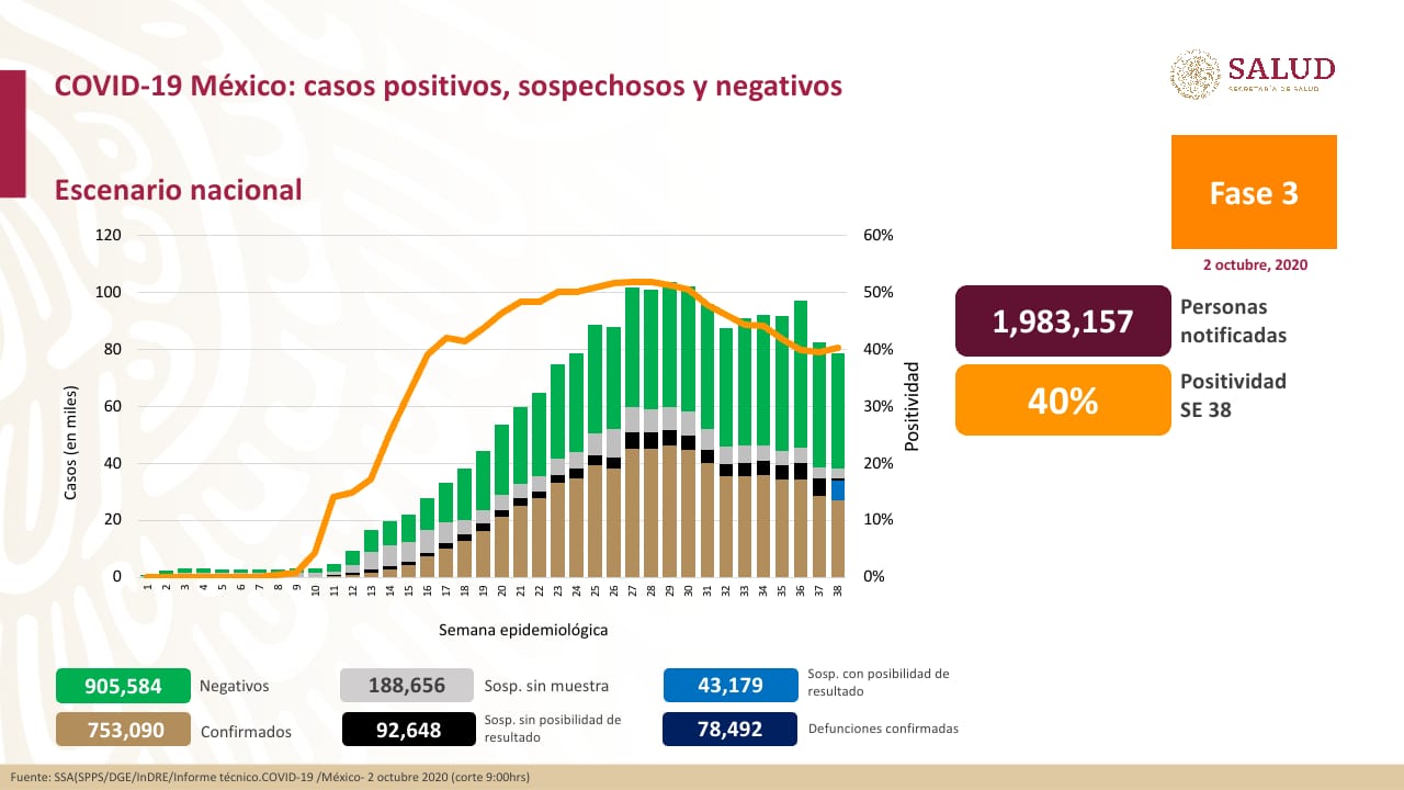 Al 02 de octubre de 2020 hay 753,090 casos confirmados #COVID19. Se han registrado 905,584 negativos, 78,492 defunciones confirmadas y 541,518 personas recuperadas. A nivel nacional, 72% de camas de hospitalización general están disponibles y 28% ocupadas. En camas con ventiladores, 77% están disponibles y 23% ocupadas.