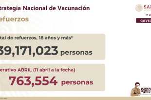 Con corte a las 21:00 h de este sábado, han recibido la vacuna de refuerzo 39 millones 171 mil 023 personas mayores de 18 años, de las cuales, 763 mil 554 corresponden al operativo especial que se lleva a cabo en coordinación con autoridades estatales y municipales para ampliar la …