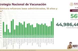 La Secretaría de Salud informa que han recibido la vacuna de refuerzo 44 millones 986 mil 463 personas mayores de 18 años, lo que representa un avance de 56 por ciento de la población objetivo. El sector Salud, en coordinación con las 32 entidades federativas, fortalece la inmunización contra COVID-19 …