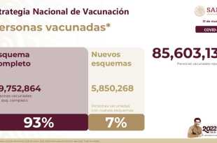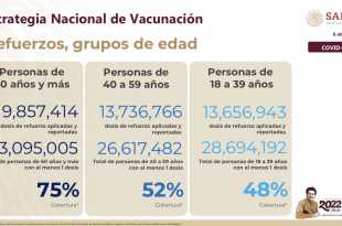 La Secretaría de Salud informa que hasta esta fecha han recibido la vacuna de refuerzo contra COVID-19, 37 millones 251 mil 123 personas mayores de 18 años. De ellas, nueve millones 857 mil 414 son mayores de 60; 13 millones 736 mil 766 tienen entre 40 y 59; y 13 …