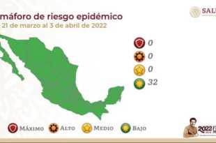 Como resultado de la disminución sostenida de contagios y hospitalizaciones por COVID-19, a partir del próximo lunes 21 de marzo y hasta el 3 de abril, las 32 entidades federativas estarán en color verde del Semáforo de Riesgo Epidémico COVID-19, informa la Secretaría de Salud. En la semana epidemiológica que …