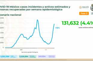 La Secretaría de Salud informa que el número de casos de COVID-19 en México aumentó 20 por ciento en la semana epidemiológica número 29, que comprende del 11 al 17 de julio, en comparación con la anterior; la epidemia activa se estima en 130 mil 534 personas con signos y …