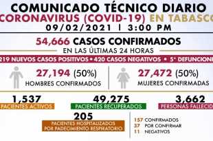 Tabasco suma 54 mil 666 casos confirmados, 49 mil 275 pacientes recuperados, 3 mil 662 personas fallecidas y 205 hospitalizados A 329 días de haberse registrado el primer caso de COVID-19 en Tabasco, la Secretaría de Salud reiteró a los tabasqueños la importancia de no bajar la guardia en las …