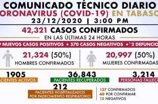 Al 23 de diciembre de 2020 hay 1,350,079 casos confirmados de #COVID19. Se han registrado 1,696,403 negativos, 120,311 defunciones confirmadas y 1,005,248 personas recuperadas. y 47% ocupadas. En camas con ventiladores, 59% están disponibles y 41% ocupadas.