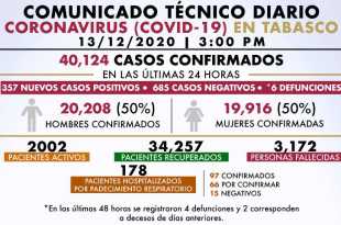 Al 13 de diciembre de 2020 hay 1,250,044 casos confirmados de #COVID19. Se han registrado 1,553,633 negativos, 113,953 defunciones confirmadas y 918,681 personas recuperadas. A nivel nacional, 58% de camas de hospitalización general están disponibles y 42% ocupadas. En camas con ventiladores, 65% están disponibles y 35% ocupadas.
