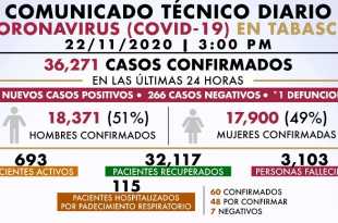 Al 23 de noviembre de 2020 hay 1,049,358 casos confirmados #COVID19. Se han registrado 1,274,269 negativos, 101,926 defunciones confirmadas y 784,693 personas recuperadas. A nivel nacional, 63% de camas de hospitalización general están disponibles y 37% ocupadas. En camas con ventiladores, 70% están disponibles y 30% ocupadas.