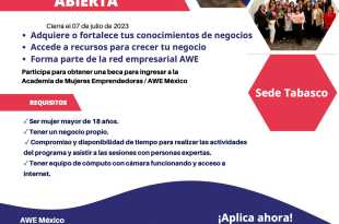 La Secretaría para el Desarrollo Económico y la Competitividad (Sedec) convoca a todas las mujeres emprendedoras de Tabasco a participar para obtener una beca e ingresar al programa internacional Academia para Mujeres Emprendedoras AWE, “Fortalece tu negocio y hazlo crecer”. La Academia para Mujeres Emprendedoras es un programa que proporciona …