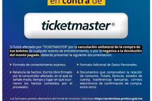 Súmate a la Acción Colectiva que Profeco promoverá contra “Ticketmaster”. Si fuiste afectado por “TICKETMASTER” por la cancelación unilateral de la compra de tus boletos de cualquier evento de entretenimiento, o por la negativa a la devolución del monto pagado, contáctanos. Los formatos podrás obtenerlos del Portal de Acciones Colectivas: …
