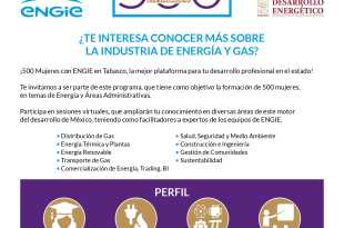 La Secretaría para el Desarrollo Energético (Sedener) invita a tabasqueñas a participar en el programa “500 mujeres con ENGIE en Tabasco”, dirigido al talento femenino que busca capacitarse y ampliar su red de conocimiento en el sector de la energía y gas, además de formar parte de la base de …