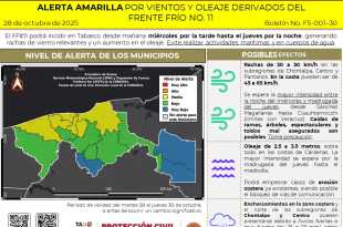 El Frente Frío No. 11 podrá incidir en Tabasco desde mañana miércoles por la tarde hasta el jueves por la noche, generando rachas de viento relevantes y un aumento en el oleaje. Evite realizar actividades marítimas y en cuerpos de agua. Rachas de 30 a 50 km/h en las subregiones …