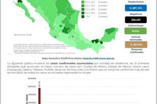 En México hasta el día de hoy se han confirmado 3, 781,661 casos totales y 286,259 defunciones totales por COVID-19. La tasa de incidencia de casos acumulados de 2,932.1 por cada 100,000 habitantes. Al corte de información del día de hoy, se registraron 286,259 defunciones totales de COVID-19. Hasta el …