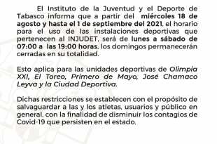 Con la finalidad de disminuir el índice de contagios de COVID-19 en la entidad, el Instituto de la Juventud y el Deporte de Tabasco (Injudet), emitió este día nuevas disposiciones para el horario y uso de las instalaciones deportivas que administra la dependencia. Será a partir de este miércoles 18 …